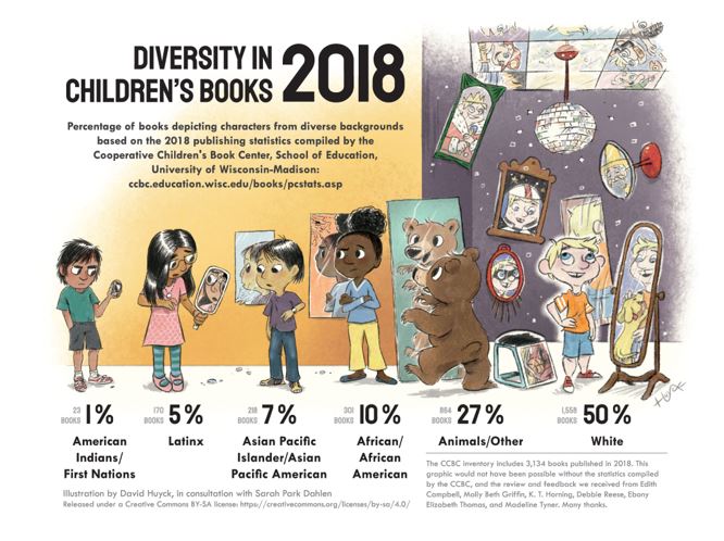 The lack of true diversity in publishing leads to fewer books featuring diverse characters. This is evidenced by the most recent Cooperative Children’s Book Center (CCBC) data, summarized in the following infographic. The most up-to-date illustration of the data is below. The most current data can be found on the CCBC’s website here.