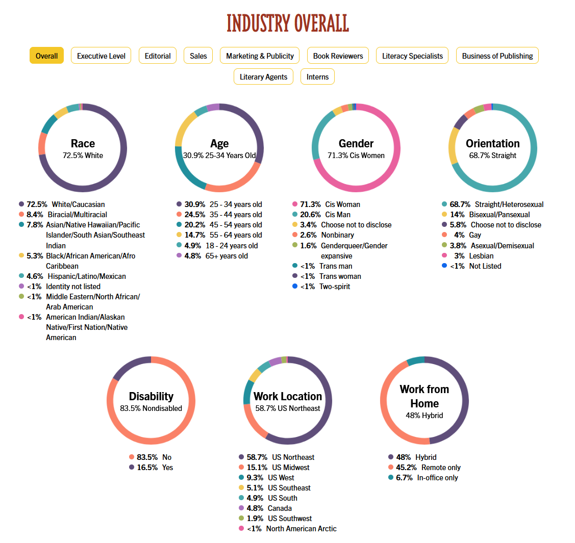 We recognize that the diversity of our country and our world is not reflected in the makeup of people working in the publishing industry today, as shown in the results of Lee & Low’s latest Baseline Survey on Diversity in Publishing from 2023. (Graphics and information are updated as new data and graphs become available.)